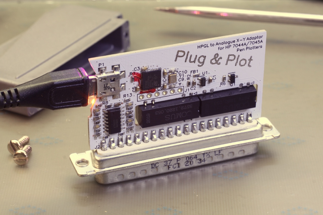 Ein STM32F103 ist mehr als kräftig genug, sich über USB als virtuelle serielle Schnittstelle zu geben, HPGL zu interpretieren, die resultierenden Bewegungen in einen Ringpuffer zu schieben und gleichmäßig zwischen den Koordinaten zu interpolieren, um dem Plotter seine langsam veränderlichen Spannungen bereitzustellen. USB ist hierfür aus mehr als einem Grund praktisch: Wenn der Ringpuffer voll ist, was schnell passiert, da Plotten eher langsam gegenüber den restlichen Aufgaben ist, kann der Controller einfach aufhören, Daten anzunehmen. Auf der PC-Seite bildet sich dann zwar ein Rückstau, aber effektiv habe ich so Übertragungsflusskontrolle umsonst und ohne Einrichtung.