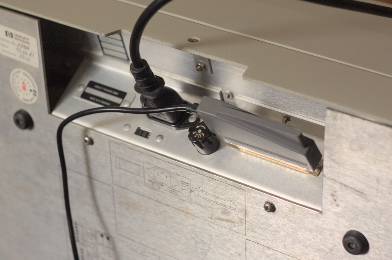 Erstens gibt es nicht viele Anforderungen an die X-/Y-Steuerspannungen. Der 7045A ist ein Messgerät und hat entsprechend zwei isolierte, hochohmige Eingänge mit freier Spannungsbereichswahl – es spricht also nichts dagegen, DAC-Ausgänge direkt mit den Bananenbuchsen auf der Vorderseite zu verbinden. Noch besser: Es gibt eine Sub-D-Buchse (im Bild oben nahe der oberen Kante zu sehen) auf der Rückseite, die alle wichtigen Signale (X, Y, TTL-Eingang zum Absetzen des Stifts) herausführt. Das heißt, ein perspektivischer Adapter kann sich dort über einen einzelnen Stecker andocken.